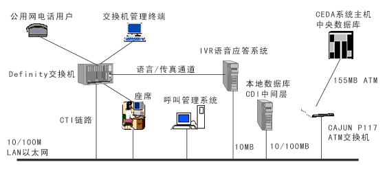 浦東機(jī)場呼叫中心系統(tǒng)建有本地?cái)?shù)據(jù)庫,但有許多信息需與中央數(shù)據(jù)庫交換。所以依托高速的ATM主干網(wǎng)絡(luò),利用基于TCP/IP網(wǎng)絡(luò)協(xié)議的CDI(CEDA Data Interface)通信方式作為中間件,進(jìn)行本地?cái)?shù)據(jù)庫與中央數(shù)據(jù)庫之間的信息交互和共享,完成本系統(tǒng)與機(jī)場信息集成系統(tǒng)的中央數(shù)據(jù)庫連通。