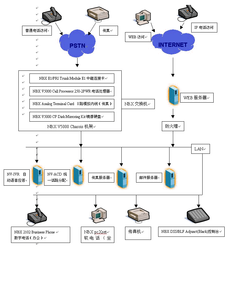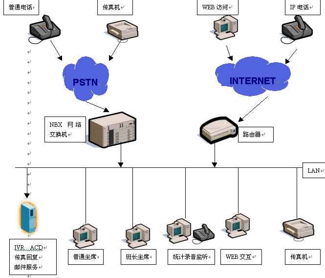 基于NBX的呼叫中心對(duì)外支持PSTN、IP兩種接入方式,可以實(shí)現(xiàn)各種接入:普通電話、傳真、IP電話、郵件、WEB訪問,NBX呼叫中心在技術(shù)上實(shí)現(xiàn)革命性的突破,在內(nèi)部實(shí)行語音數(shù)據(jù)兩網(wǎng)合一,從而實(shí)現(xiàn)外部各種訪問的統(tǒng)一路由分配。