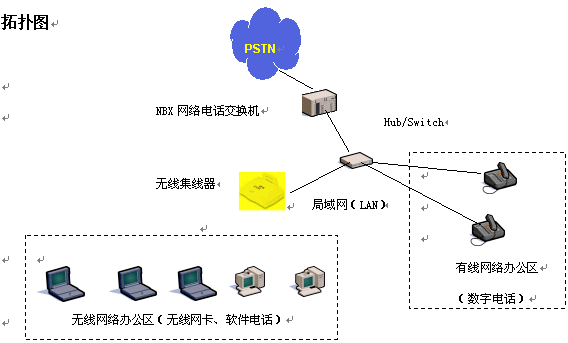 隨著信息時代的來臨,電話、電腦成了辦公領(lǐng)域的重要工具,人們在辦公室通過計(jì)算機(jī)網(wǎng)絡(luò)共享數(shù)據(jù)資源、傳遞數(shù)據(jù)信息,彼此間通過電話言語溝通。在人們享受到高科技帶來的高效率的同時,也感到一些不便,例如計(jì)算機(jī)網(wǎng)絡(luò)、電話網(wǎng)都需要單獨(dú)鋪設(shè)專用的線路,線路的變更往往是讓人心煩的事情。隨著各公司推出無線局域網(wǎng)絡(luò)解決方案(AirConnect)和NBX網(wǎng)絡(luò)電話交換機(jī)平臺的推出,通過無線局域網(wǎng)絡(luò)技術(shù),語音、數(shù)據(jù)兩網(wǎng)合一技術(shù),將電腦、電話機(jī)合二為一,同時從線路的束縛中解放出來。人們再也不用擔(dān)心布線問題,可以隨處移動辦公,享受無線網(wǎng)絡(luò)、無線話音,大大提高人們的辦公效率。