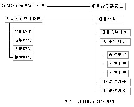 這支隊伍既有企業(yè)高級管理層所組成的指導委員會和咨詢公司人員,也有來自信息部門的技術人員和相應職能部門的熟悉企業(yè)流程的業(yè)務人員所組成的實施小組和職能小組。項目隊伍組織結構如圖2所示。