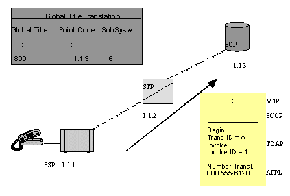 主叫用戶拔叫800用戶號,這就觸發(fā)位于交換局(圖中SSP)內的路由應用程序發(fā)出一個TCAP查詢。圖中的STP收到查詢,用MTP層和SCCP層協(xié)議轉發(fā)查詢到SCP的800號碼數據庫。這樣,SSP中的應用程序就和SCP直接建立了對話。