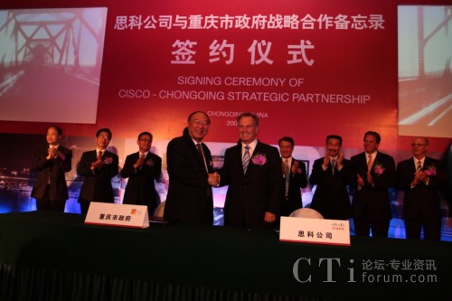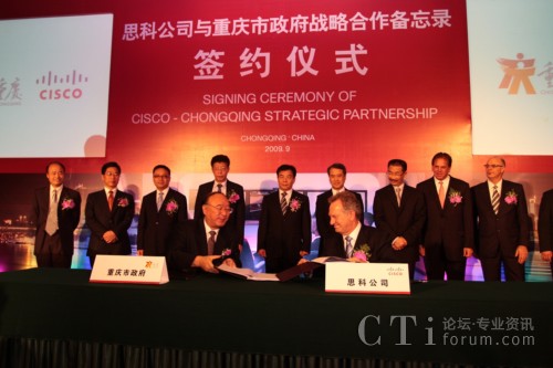 CTI論壇(ctiforum)9月14日消息:2009年9月11日,重慶市人民政府與思科正式簽訂合作備忘錄,雙方將結(jié)為戰(zhàn)略合作伙伴關(guān)系,就通信產(chǎn)品制造、“智能+互聯(lián)城市”試點(diǎn)示范、綠色技術(shù)研發(fā)與創(chuàng)新及風(fēng)險(xiǎn)投資等多方面展開深入合作。此次合作將進(jìn)一步加快重慶市產(chǎn)業(yè)結(jié)構(gòu)和產(chǎn)品結(jié)構(gòu)調(diào)整,促進(jìn)內(nèi)陸開放城市建設(shè);加快發(fā)展重慶通信產(chǎn)品產(chǎn)業(yè)集群,把重慶建設(shè)成為西部重要的現(xiàn)代通信產(chǎn)品制造基地;推動(dòng)以信息產(chǎn)業(yè)為主體的重慶高新技術(shù)產(chǎn)業(yè)發(fā)展以及本土創(chuàng)新和可持續(xù)性能力的提供,更高效便捷地加快本土企業(yè)的國(guó)際化進(jìn)程;整合多方國(guó)際資源,以推進(jìn)重慶在中國(guó)率先成為“智能+互聯(lián)城市”,讓市民享受更多的工作和生活便利及實(shí)惠。作為思科在華創(chuàng)新及可持續(xù)發(fā)展戰(zhàn)略實(shí)施的又一里程碑,此次合作不僅是思科“智能+互聯(lián)城市”計(jì)劃在中國(guó)與當(dāng)?shù)卣氖锥群献黜?xiàng)目,也是思科在“協(xié)作型創(chuàng)新模式”指導(dǎo)下激勵(lì)本土創(chuàng)新的全新實(shí)踐。
