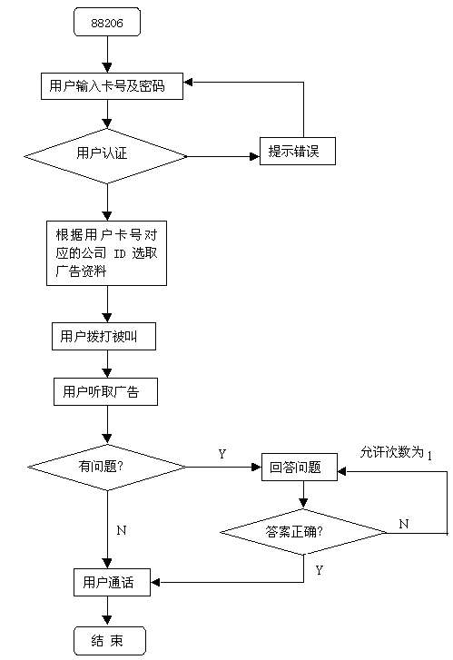 4)可設(shè)置廣告廠家的客戶服務(wù)中心電話,如電話用戶需要,可將其與該電話連通,同時在卡上計費,費率按本地到該通達(dá)地區(qū)計算。
