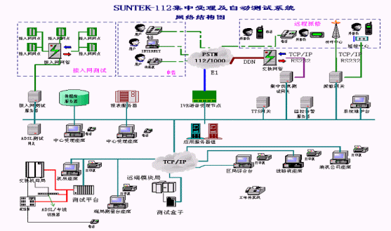 系統(tǒng)在設計時采用集中受理、分布測量的結構化、模塊化設計:受理中心進行112的集中受理和業(yè)務處理,端局完成相應用戶線的測試功能,所有測試數(shù)據(jù)等均送至受理中心。系統(tǒng)測試準確、任務分擔、負荷均衡,處理速度快,性能可靠。系統(tǒng)的受理模塊和測試模塊相互協(xié)調又各自獨立,使二者可以統(tǒng)一地作為SUNTEKTM-112集中受理及自動測試系統(tǒng),又能各自作為子系統(tǒng)與其它廠家(112系統(tǒng)、97系統(tǒng)、1000號等)的產品結合起來為112系統(tǒng)服務。系統(tǒng)網絡結構圖如下所示: