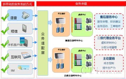 為了達到異地容災的目的,新太科技為美的集團在順德與和合肥分別設立了兩個呼叫中心,兩個呼叫中心通過廣域網(wǎng)絡連接起來。兩個呼叫中心都可以獨立運作,同時又可以進行統(tǒng)一管理。
