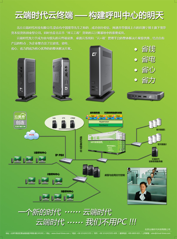 云端時代是由有中國寬帶先生之稱的,成功創(chuàng)辦亞信、網(wǎng)通并帶領其上市的田溯寧博士旗下寬帶資本投資的創(chuàng)業(yè)型公司。同時也是北京市“祥云工程”計劃資助的云計算基地中的重要成員。 云端時代致力于成為業(yè)內(nèi)領先的云終端設備、桌面云系統(tǒng)和“云+端”管理平臺的整體解決方案提供商,幫助中國企業(yè)向 “云+端”架構(gòu)轉(zhuǎn)型。 云端時代的管理團隊由具有國際化背景和本地化經(jīng)驗的優(yōu)秀人才構(gòu)成,核心成員來自國內(nèi)外知名的瘦客戶機設備廠商、嵌入式芯片廠商、集成電路企業(yè)以及通訊企業(yè)等。如:AMD、聯(lián)想、威盛、升騰、Wyse、控創(chuàng)等等。