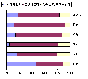 圖1、無(wú)線OSS計(jì)費(fèi)市場(chǎng):2000年全球按照地區(qū)劃分的不同公司類(lèi)型的整體市場(chǎng)收入估計(jì)(百萬(wàn)美元)