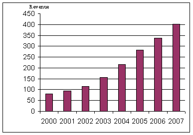圖1表明了2000年至2007年亞太新一代移動網(wǎng)絡市場的收入與增長。