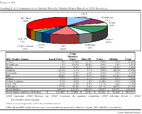 * 企業(yè)能力:由于沒有市話公司,AT&T缺乏對普通消費者的最后一公里的接入手段。收購地區(qū)性市話公司的可能性不大;而新建市話網(wǎng)絡(luò)成本巨大,不易成功。因此在2001-2002年,AT&T以超過1000億美元的巨資收購了3家地區(qū)性的寬帶接入提供商,希望以此建立與普通消費者的直接聯(lián)系。