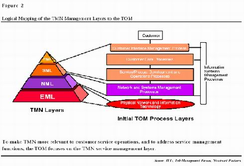 國際電聯(lián)的出發(fā)點雖好,但它更強調(diào)從網(wǎng)絡(luò)元素層開始的清晰的統(tǒng)一體系,而為了保護自己的商業(yè)秘密,各大運營商往往不希望公開自己的網(wǎng)絡(luò)元素層的標(biāo)準(zhǔn),同時,網(wǎng)絡(luò)元素層的標(biāo)準(zhǔn)化對運營商的業(yè)務(wù)發(fā)展幫助不大。在熱烈討論了一段時間之后,TMN漸漸被忽視了。而另一只希望從技術(shù)角度解決管理問題的力量,電信管理論壇,卻帶有一定偶然性地逐漸確立了自己的地位。電信管理論壇在開始的時候并沒有夢想能建立覆蓋整個電信運營企業(yè)的管理系統(tǒng),其初衷是解決在當(dāng)時日漸突出的跨企業(yè)的客戶數(shù)據(jù)交換問題。因此,和國際電聯(lián)不同,電信管理論壇從開始就非常強調(diào)實用性,并把目光集中到了各企業(yè)相互間有大量數(shù)據(jù)交換,因此迫切需要建立標(biāo)準(zhǔn)的服務(wù)管理層和網(wǎng)絡(luò)管理層,并提出了電信運營支持系統(tǒng)(OSS)的概念,并公布了模塊化的電信運營導(dǎo)圖(TOM)。