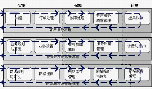 由于是從技術(shù)的角度出發(fā),國內(nèi)在介紹OSS的時候,是以實施、保障和計費縱向的角度介紹的,而當(dāng)我們認真地考察TOM圖時會發(fā)現(xiàn),OSS最大的意義是橫向的,即從橫向看的TOM圖的每一層,正好構(gòu)成一個完整的業(yè)務(wù)循環(huán),從上到下依次為:客戶服務(wù)流程、運營流程和系統(tǒng)管理流程。電信企業(yè)只有按照TOM圖來規(guī)劃自己的業(yè)務(wù)部門劃分和相互銜接,才能最大限度地利用OSS所能提供的支持。而現(xiàn)有運營商的部門設(shè)置都仍是縱向劃分的,要轉(zhuǎn)成按流程橫向劃分,必須要對電信運營管理有深入了解。國內(nèi)介紹OSS的企業(yè)大都是系統(tǒng)集成商,不懂電信運營,同時為了自己銷售的需要,都是從技術(shù)的角度縱向介紹,更進一步加大了運營商利用OSS體系實現(xiàn)管理轉(zhuǎn)型的難度!