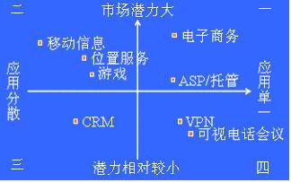 * 第三象限:市場潛力比較小,應(yīng)用比較分散。由于經(jīng)營靈活,貼近客戶,小服務(wù)提供商在此會有非常大的優(yōu)勢。大型運營商如想經(jīng)營此象限內(nèi)的業(yè)務(wù),必須努力減小不同用戶需求的差異,并造成成本領(lǐng)先。如客戶關(guān)系管理(CRM)。