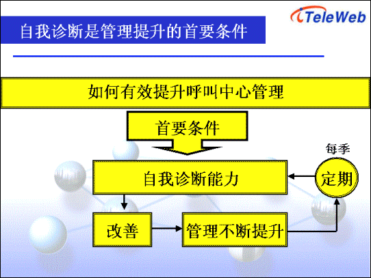在如何提升呼叫中心運(yùn)營管理中,自我診斷是首要步驟。通過對(duì)現(xiàn)有管理流程的診斷,找出需要改進(jìn)的項(xiàng)目以及空間,從而評(píng)估與呼叫中心整體營運(yùn)目標(biāo)是否相符。同時(shí)透過與整體組織架構(gòu),同業(yè)比較以及標(biāo)準(zhǔn)基準(zhǔn),即可找出需要改進(jìn)的地方。