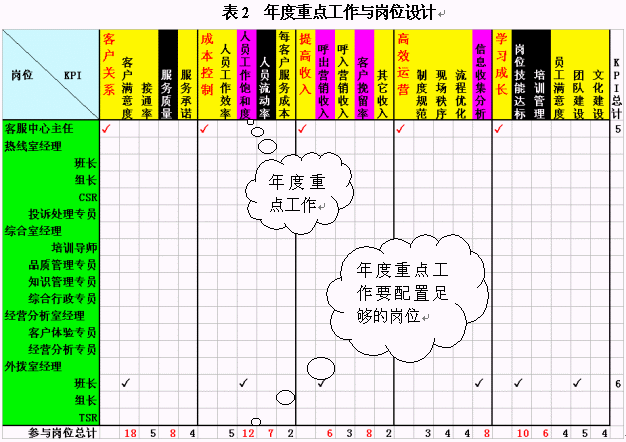 在這里,我們先以崗位設(shè)計(jì)來(lái)舉例。經(jīng)常有呼叫中心主管把每個(gè)崗位的職責(zé)都設(shè)計(jì)的非常詳細(xì),包括了每天來(lái)做什么,說(shuō)什么,錄入什么,甚至是打掃某區(qū)域衛(wèi)生之類。但是,我看遍了每一條,也沒找到這個(gè)崗位應(yīng)該對(duì)什么業(yè)績(jī)"負(fù)責(zé)任",該對(duì)哪些工作做出貢獻(xiàn)。此處建議各位把效益評(píng)價(jià)體系、年度重點(diǎn)工作與崗位設(shè)計(jì)結(jié)合起來(lái)。如表2所示,我們可以把效益評(píng)價(jià)體系作為KPI放在橫坐標(biāo)中,而崗位設(shè)置則是縱坐標(biāo)。每個(gè)崗位對(duì)應(yīng)的行中,可以勾畫其應(yīng)負(fù)責(zé)或者做出主要貢獻(xiàn)的項(xiàng)目。這些項(xiàng)目不能超過(guò)6個(gè),因?yàn)樘嗟捻?xiàng)目會(huì)使得這個(gè)崗位無(wú)所適從,最終的結(jié)果是哪個(gè)也沒做好。當(dāng)你勾畫完成之后,請(qǐng)計(jì)算每列的"對(duì)勾"數(shù)目,看看你本年度的重點(diǎn)工作是不是有較多崗位負(fù)責(zé)呢?