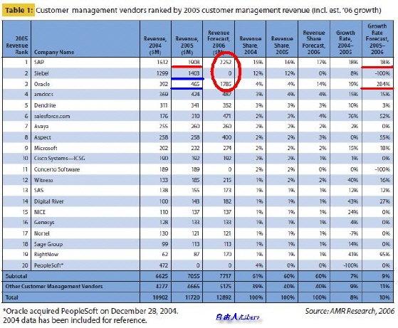 從圖中可以看出,2005年SAP CRM的全球營收為19.08億美元,Oracle+Siebel(PeopleSoft已計入Oracle)CRM的全球營收為18.69億美元,落后于SAP CRM。ARM Research的預(yù)計,SAP CRM在2006的營收將達(dá)22.52億美元,而Oracle Siebel則只有17.85億美元。