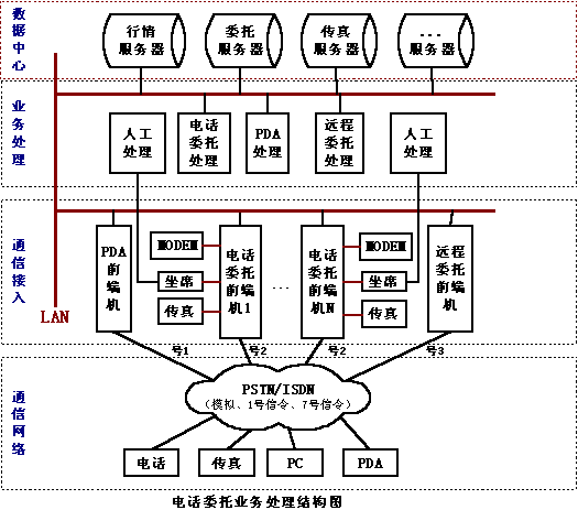 第一種方案是在證券營業(yè)部加專用的前端機和處理機,申請獨立的電話線路來處理PDA的委托,PDA和營業(yè)部前端機采用雙向或單向的DTMF收發(fā)的方式完成通訊。根據(jù)市場的情況來看,這種方式不容易被證券營業(yè)部和股民接受,證券營業(yè)部要申請一定數(shù)量的電話線路,和證券電話委托的線路不能共用,增加了營業(yè)部的費用。由于線路的限制,股民在做委托查詢時往往出現(xiàn)線路阻塞等情況,另外DTMF通訊方式的有速度慢,信息容量有限,抗干擾性差等缺點,股民不容易接受。目前東方潮公司的“東方獵人”的委托就是采用這種方式。