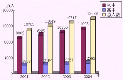 2001年,中國(guó)大陸中學(xué)學(xué)生人數(shù)已達(dá)10765萬(wàn)人,而且學(xué)生人數(shù)還在快速增長(zhǎng)。初中學(xué)生人數(shù)以每年6.5%的速度增長(zhǎng),普通高中學(xué)生人數(shù)也以每年10%-11%的速度增長(zhǎng)?梢钥闯觯逃袌(chǎng)巨大的潛力和商機(jī)。