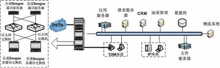 系統(tǒng)整體采用集中式架構,呼叫中心平臺采用東進公司基于Yessoe技術開發(fā)的Seegoe多媒體交換機和Seegoe通信服務器。呼叫中心平臺與物流公司內部的物流管理系統(tǒng)(如LM、SCM)通過TCP/IP進行結合。呼叫中心系統(tǒng)具有豐富的媒體資源和強大的處理能力,并提供功能模塊的N+1全冗余備份,滿足了高負荷、大并發(fā)和關鍵業(yè)務的可靠運營。其次,Seegoe呼叫中心平臺在媒體交換層以全新的IP架構實現(xiàn)網絡融合、應用融合和業(yè)務融合,能夠很好的滿足電視購物行業(yè)對呼叫中心的要求。