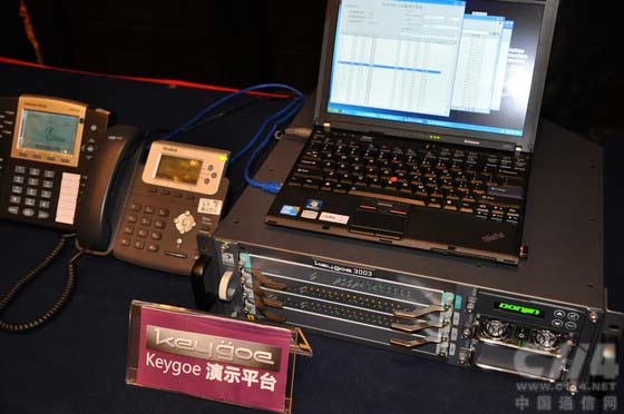 現(xiàn)場(chǎng)兩套演示系統(tǒng)中,一套以Keygoe 3000系列機(jī)箱承載最新研發(fā)的高密度VoIP資源處理板PFBT480X,實(shí)現(xiàn)整機(jī)最大1920路VoIP語(yǔ)音處理,展示了keygoe 3000多媒體交換機(jī)在大容量IP呼叫和語(yǔ)音處理的卓越性能。另一套則展示了最新的Keygoe1001系列多媒體交換機(jī),該機(jī)通過(guò)內(nèi)置主控CPU板,將語(yǔ)音交換、語(yǔ)音處理以及應(yīng)用程序整合在一個(gè)高為1U的物理機(jī)箱中,為中小型規(guī)模業(yè)務(wù)應(yīng)用提供具有較強(qiáng)綜合性、靈活性和完整性的運(yùn)營(yíng)平臺(tái)。