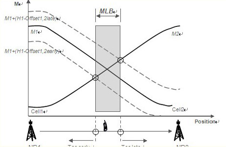 過早、過晚切換是由于目標(biāo)小區(qū)切換門限過低和過高所致。對(duì)應(yīng)過早和過晚臨界切換門限之間的區(qū)間就是合理的移動(dòng)性優(yōu)化范圍。頻內(nèi)的負(fù)載均衡也可以通過調(diào)整切換門限值來引導(dǎo)用戶和負(fù)荷由高負(fù)荷小區(qū)遷移至低負(fù)荷小區(qū),很顯然可調(diào)的門限區(qū)間就是移動(dòng)性優(yōu)化允許的范圍。這個(gè)范圍對(duì)應(yīng)相鄰小區(qū)的重覆蓋面積,在LTE中理論上大概相當(dāng)于正常小區(qū)面積的15%,可操作的價(jià)值不是很大。愛立信更傾向于異頻或者異系統(tǒng)的負(fù)荷均衡方案,增益比較明顯。如下圖,一個(gè)終端從左至右移動(dòng),M1、M2分別是接收到eNB1和eNB2的信號(hào)強(qiáng)度曲線,兩條曲線相交點(diǎn)對(duì)應(yīng)的地理位置處終端接收到的信號(hào)強(qiáng)度相同,對(duì)cell1到cell2的切換,下面的虛線對(duì)應(yīng)過早切換臨界,上面的虛線對(duì)應(yīng)過晚切換臨界,兩線與M2相交點(diǎn)對(duì)應(yīng)合理切換門限區(qū)間,也是頻內(nèi)負(fù)載均衡MLB的可調(diào)范圍。
