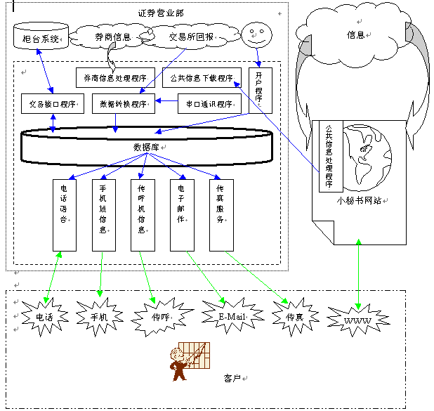 面對越來越激烈的競爭,各個券商使出渾身解數(shù),推出如透支、手續(xù)費返還等各種吸引客戶的手段;運用各種各樣的的交易方式如:營業(yè)部大戶室、家庭遠(yuǎn)程大戶室、網(wǎng)上交易、電話委托以及手機炒股、股易通、WAP網(wǎng)上交易等等。然而,這些都屬于被動的服務(wù)方式,對于業(yè)余炒股的大多數(shù)中小戶、散戶來說,不可能每天花數(shù)小時瀏覽股市的各種信息。因此,不知道配股繳款、錯過配售新股等情況時有發(fā)生,給客戶造成較大的經(jīng)濟損失;一些重大消息、重大新聞不能及時獲知,延誤了投資的有利時機。據(jù)調(diào)查,目前參加二級市場配售的投資者比例不足20%。