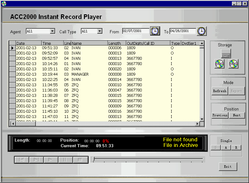 ACC2000 多媒體溝通中心采用最先進(jìn)的海量存儲(chǔ)設(shè)備DVD RAM構(gòu)建實(shí)時(shí)多通道語音錄制、備份系統(tǒng)��ACC2000 DVD Record Backup。這個(gè)系統(tǒng)可以根據(jù)管理員設(shè)定的錄音對象,對符合錄音條件的通話自動(dòng)進(jìn)行錄音!