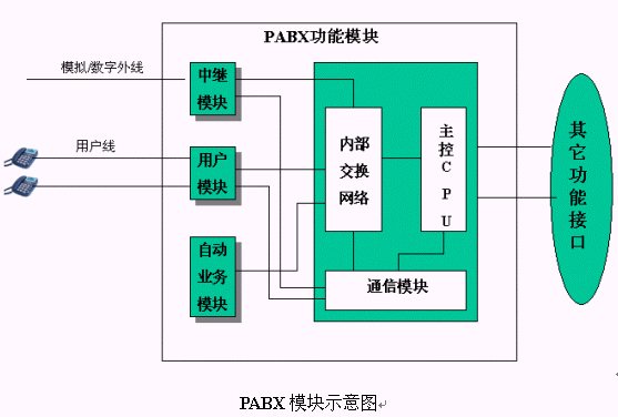 PABX模塊采用了三級(jí)分布分散的控制方式,這三級(jí)由主控板級(jí)、通訊控制級(jí)和各功能模塊級(jí)組成。各功能模塊單板實(shí)現(xiàn)各功能板的自身控制,通訊控制級(jí)模塊主要負(fù)責(zé)主控板級(jí)和各功能模塊級(jí)之間的數(shù)據(jù)通訊,實(shí)現(xiàn)主控板對(duì)各功能模塊的協(xié)調(diào)和控制。模塊內(nèi)部采用了先進(jìn)的內(nèi)存管理技術(shù)、先進(jìn)的通信方式和先進(jìn)的控制方式,因而獲得了極高的CPU通訊帶寬和處理能力。