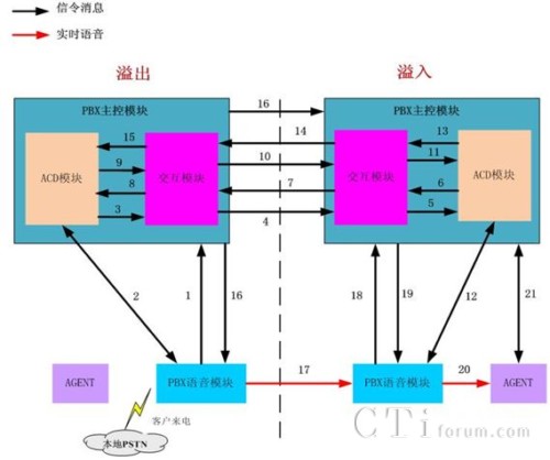 通過PBX/ACD建立一種電話路由共享和語音溢出的方法,實現(xiàn)多套聯(lián)絡(luò)中心平臺之間語音的動態(tài)互溢,透明地為客戶提供優(yōu)質(zhì)、及時的電話服務(wù),客戶感覺不到任何差異。通過PBX/ACD建立一種電話路由共享和語音溢出的方法,作為行業(yè)現(xiàn)有實現(xiàn)方法的有效補充,解決了行業(yè)現(xiàn)有實現(xiàn)方法的無法實現(xiàn)最短路徑溢出問題,通過ACD的“先排隊后進門”的預(yù)約預(yù)定模式,動態(tài)判斷彼此的運行狀態(tài)和處理能力,無需先將語音溢出到另外一個聯(lián)絡(luò)中心,只有當(dāng)另外一個聯(lián)絡(luò)中心確定能提供相應(yīng)的語音服務(wù)和人工服務(wù)的時候,語音才在PBX語音層面通過標(biāo)準通信協(xié)議進行互聯(lián)互通,避免實時語音被多次溢出,實時實時語音溢出只走最短路徑,保證客戶電話只需一次溢出就能立即提供語音服務(wù)和人工服務(wù),大幅減少了語音溢出的處理時間,同時也大幅減少了語音處理次數(shù),提升了系統(tǒng)處理性能。