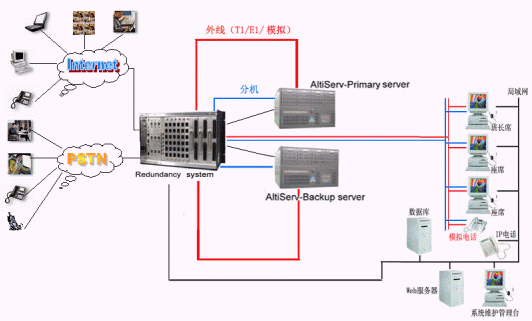 奧迪堅(jiān)通訊系統(tǒng)有限公司作為CTI通訊平臺(tái)的提供商,在技術(shù)上不斷創(chuàng)新,對(duì)產(chǎn)品精益求精,尤其體現(xiàn)在對(duì)系統(tǒng)的運(yùn)行安全性的要求上,為了防止電信接入設(shè)備或者企業(yè)網(wǎng)絡(luò)出現(xiàn)故障而造成的呼叫中心服務(wù)中斷,奧迪堅(jiān)呼叫中心系統(tǒng)提供安全保護(hù)冗余切換系統(tǒng),來(lái)保障呼叫中心在意外情況下的正常工作,該安全冗余切換系統(tǒng)通過(guò)對(duì)電源、T1/E1、模擬trunk、分機(jī)座席、以及各種網(wǎng)絡(luò)鏈路串口等備份切換來(lái)實(shí)現(xiàn)可靠的運(yùn)行。除此之外,奧迪堅(jiān)系統(tǒng)本身也提供強(qiáng)大的安全保障,由于采用先進(jìn)IP內(nèi)核一體化設(shè)計(jì),集傳統(tǒng)PBX、CTI服務(wù)器、IVR、ACD、Recording、FAX等眾多設(shè)備于一體,這樣有效的避免了因?yàn)橥鈷煸O(shè)備過(guò)多以及設(shè)備供應(yīng)商的不同而存在的兼容性的問(wèn)題,從而降低了給呼叫中心系統(tǒng)帶來(lái)的的不穩(wěn)定的安全隱患。在系統(tǒng)之外依靠安全保護(hù)冗余切換系統(tǒng),可以實(shí)現(xiàn)外線(xiàn)、分機(jī)、以及各種鏈路接口的雙倍安全運(yùn)行。如上圖所示:兩臺(tái)奧迪堅(jiān)的呼叫中心服務(wù)器和奧迪堅(jiān)安全冗余切換系統(tǒng)構(gòu)成呼叫中心熱備份系統(tǒng),在兩臺(tái)服務(wù)器中安裝所有的呼叫中心功能模塊。通常情況下由主呼叫中心服務(wù)器提供系統(tǒng)的正常運(yùn)行,備份服務(wù)器通過(guò)安全保護(hù)冗余切換系統(tǒng)的服務(wù)監(jiān)測(cè)模塊來(lái)監(jiān)測(cè)主服務(wù)器的各項(xiàng)設(shè)備和鏈路的使用情況,當(dāng)主服務(wù)器遭遇突發(fā)故障不能繼續(xù)工作時(shí),系統(tǒng)馬上實(shí)施自動(dòng)切換,就會(huì)通過(guò)安全保護(hù)冗余切換系統(tǒng)將系統(tǒng)切換到備份的呼叫中心系統(tǒng)上來(lái),此鏈路可以是數(shù)據(jù)、語(yǔ)音、網(wǎng)絡(luò)、串口等。當(dāng)安全保護(hù)冗余切換系統(tǒng)自身出現(xiàn)斷電或者其他故障時(shí),所有鏈路均保持正常工作狀態(tài)。