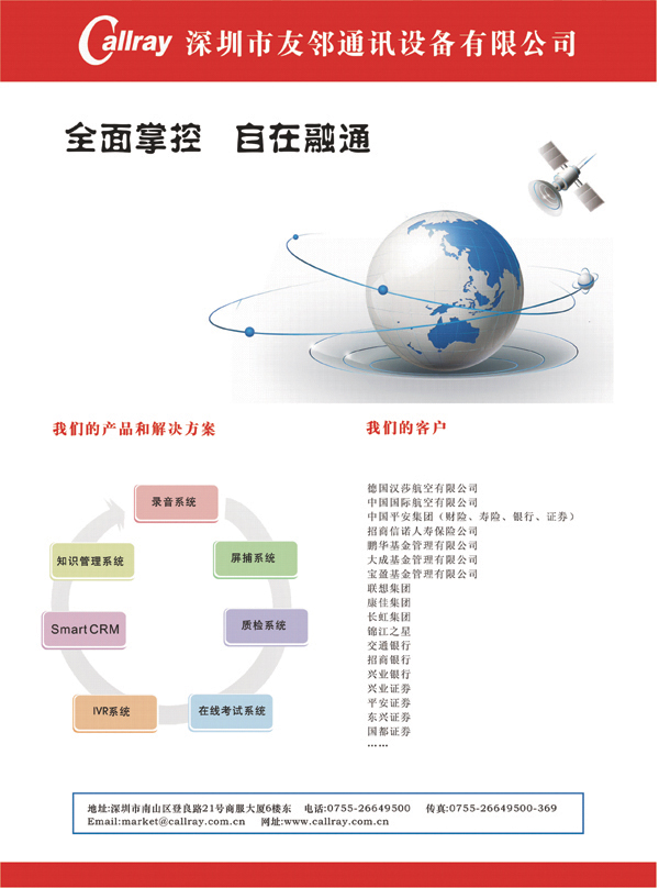 深圳市友鄰?fù)ㄓ嵲O(shè)備有限公司作為國(guó)內(nèi)最早的呼叫中心質(zhì)量管理軟件開(kāi)發(fā)商之一,在專業(yè)技術(shù)、現(xiàn)場(chǎng)開(kāi)發(fā)和工程實(shí)施等方面均積累了豐富的經(jīng)驗(yàn)。友鄰公司將承諾對(duì)這一新興行業(yè)的責(zé)任,即立足于自主開(kāi)發(fā)并結(jié)合中國(guó)國(guó)情,并始終堅(jiān)持走呼叫中心質(zhì)量管理軟件這一方向,是相關(guān)行業(yè)用戶和業(yè)務(wù)應(yīng)用軟件開(kāi)發(fā)商的首選之一。