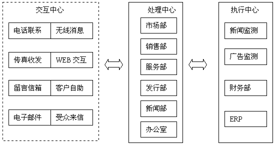 協(xié)同CRM結(jié)合呼叫中心與客戶廣泛交互,對(duì)信息進(jìn)行全面綜合處理。系統(tǒng)可以分為交互中心、處理中心、執(zhí)行中心三部分。