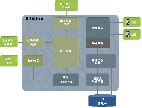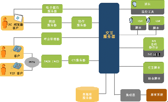 交互(輔助)服務器是客戶服務系統(tǒng)體系結(jié)構(gòu)的主要組件,控制所有的客戶交互以及它們在座席代表間的分配。其主要功能是: