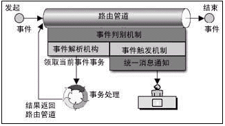 在路由管道中流轉(zhuǎn)著加載了業(yè)務(wù)的工作流事件。事件按照事先定義的路由規(guī)則流轉(zhuǎn),事件的路由規(guī)則定義了事件在路由管道中可以?康摹罢九_”,同時定義了事件到達“站臺”時可以領(lǐng)取并處理加載在事件上的業(yè)務(wù)的角色。事件從始發(fā)站臺進入路由管道,經(jīng)過一個或多個中間站臺,最后到達終點站。事件每?恳粋站臺,相關(guān)人員領(lǐng)取事務(wù),并進行處理后重新裝載事務(wù),觸發(fā)事件向下一個站臺流轉(zhuǎn),除非事件已經(jīng)到達終點站。