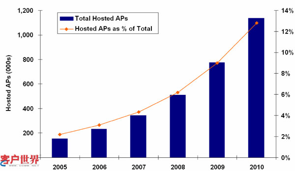 根據(jù)datamonitor在2006年的分析,自2005年起,全球呼叫中心托管的總數(shù)約二十萬(wàn)個(gè)座席,占全球呼叫中心的總座席數(shù)得2%,到2008年成長(zhǎng)到約五十萬(wàn)個(gè)座席,占總量的6%左右,在2010年時(shí)更會(huì)成長(zhǎng)到超過(guò)一百萬(wàn)個(gè)座席占總數(shù)的10%左右。所以整個(gè)托管市場(chǎng)來(lái)說(shuō)將會(huì)持續(xù)不斷的成長(zhǎng)(見圖二)。