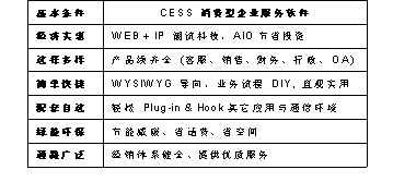 CESS消費(fèi)型服務(wù)軟件具有經(jīng)濟(jì)實(shí)惠、選擇多樣、簡(jiǎn)單快捷、配套自選、綠能環(huán)通路廣泛等特點(diǎn),采用Web+IP的潮流科技,AIO節(jié)省投資,使軟件經(jīng)濟(jì)實(shí)惠;CESS軟件產(chǎn)品線(xiàn)齊全,涵蓋客服、銷(xiāo)售、財(cái)務(wù)、行政、OA等很多方面,給您多樣選擇;WYSIWYG(所見(jiàn)即所得)導(dǎo)向,業(yè)務(wù)流程DIY,讓您至需要?jiǎng)觿?dòng)鼠標(biāo)就可以DIY您想要得到的設(shè)計(jì),不再需要麻煩IT人員,只管實(shí)用,簡(jiǎn)單快捷;輕松Plug-in & Hook其它應(yīng)用與通信環(huán)境,可根據(jù)您的需要配套自選;節(jié)能減碳、省話(huà)費(fèi)、省空間,綠色環(huán)保;經(jīng)銷(xiāo)體系健全、提供優(yōu)質(zhì)服務(wù),通路廣泛。