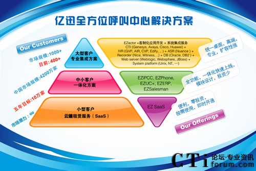 Service Software”;而“易之愛彼喜喜”及“易之風(fēng)”產(chǎn)品,顧名思義,就是億迅推出基于CESS理念的呼叫中心產(chǎn)品EZIPCC及EZPhone的中文注釋,因?yàn)楹?jiǎn)單容易,讓客戶更喜歡;“CHANGE”不僅代表了億迅發(fā)展的這11年一直秉持創(chuàng)新與改革的經(jīng)驗(yàn)哲學(xué),也代表了億迅自主研發(fā)的核心CRM產(chǎn)品“EZactor”在高端市場(chǎng)與主流戰(zhàn)略合作伙伴的關(guān)系,其中的“C”,是指CISCO;“H”指Huawei;“A”指“AVAYA”;“N”指Nuance;“G”指Genesys;而最后的“E”,則代表了eSOON。