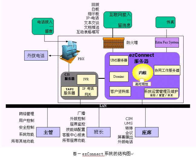 ezConnect系統是由訊泰信息科技公司的北京研發(fā)中心設計開發(fā)出來的一個成熟的多媒體呼叫中心產品。支持傳統電話、web、電子郵件、傳真、語音郵件、IP電話、短消息、WAP等用戶接入方式;對客戶請求采用基于座席技能的智能分派;提供文本交談、白板共享、協同填表、文檔推送、IP電話、短消息發(fā)送等多種實時交流工具;有非常實用的實時監(jiān)控和報表子系統。核心部分的設計采用分離分層的思想,實現了相對于PBX、IVR、CRM的透明性。系統的配置非常靈活,可以在很短的時間內完全改變整個客戶端的風格,或支持一種新的語言。整個系統建立在Java平臺上,具有良好的可移植性。下面是ezConnect系統的結構圖: