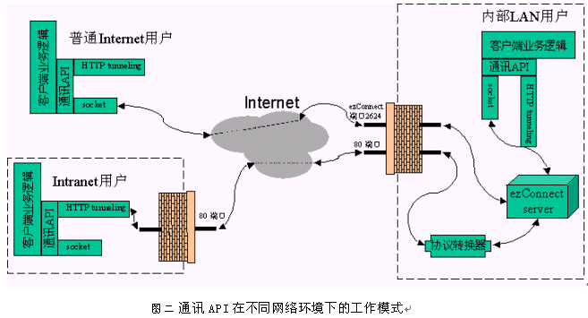 普通Internet用戶(例如撥號上網或小區(qū)ADSL)對Internet資源的訪問一般不受限制,所以只需解決如何穿越保衛(wèi)著ezConnect服務器的防火墻的問題。訊泰公司的方案是開發(fā)一套通用的通訊API, 在此API的基礎上實現呼叫中心客戶端的業(yè)務邏輯(參見下圖)。這個通訊API的底層有兩種方式:直接socket連接和HTTP隧道,API會自動檢測其所處的網絡環(huán)境來選擇適當的底層連接方式。一般而言,保障著ezConnect服務器的防火墻應該開放著ezConnect的協議端口2624。 所以普通Internet用戶訪問ezConnect系統時,客戶端軟件與服務器軟件通過建立直接的socket連接來互通信息。目標3由此達到。
