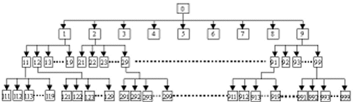 查號(hào)臺(tái)提示音可分4級(jí),第1級(jí)序號(hào)為0,這一級(jí)固定為0;第2級(jí)序號(hào)為1、2、3~9;第3級(jí)序號(hào)為11、12~19、21、22~29……91、92、93~99,共81個(gè);第4級(jí)序號(hào)為111、112、~119、121、122、~129、131、……999共729個(gè)。如下圖所示。