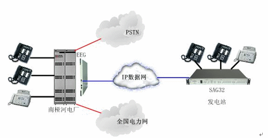 說明:南椏河電廠在現(xiàn)有的IP網(wǎng)絡(luò)基礎(chǔ)上,利用IP中繼網(wǎng)關(guān)EEG與SAG32電信級模擬VoIP網(wǎng)關(guān)實現(xiàn)交換機(jī)的遠(yuǎn)程放號,實現(xiàn)了發(fā)電站與電廠、省電力網(wǎng)、電信等的組網(wǎng),解決了實際的通信問題。在方案中,具有組網(wǎng)簡單,維護(hù)方便,通話質(zhì)量高等特點,得到當(dāng)?shù)赜脩舻恼J(rèn)可。