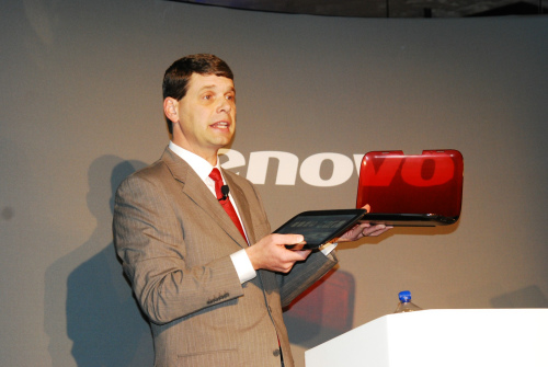 圖:聯(lián)想集團(tuán)COO Rory Read向與會(huì)者展示聯(lián)想IdeaPad U1混合筆記本