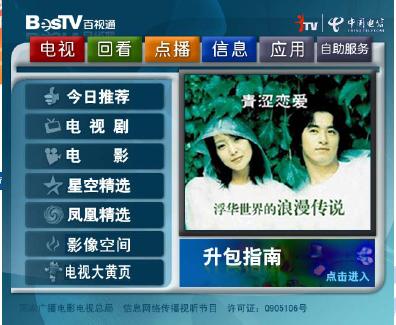 上海IPTV點播節(jié)目達(dá)3000小時,包括電影、電視劇、音樂娛樂、紀(jì)實節(jié)目、少兒、體育以及教育等欄目。點播節(jié)目改變了“你播我看”的電視被動接受方式,讓用戶可以根據(jù)自己的喜好來選擇喜愛的個性化節(jié)目,大大提高了用戶的喜愛度。值得一提的是,當(dāng)收看電影中途退出的時候,系統(tǒng)提供了“書簽”功能,下一次收看時,便可以從書簽處繼續(xù),方便用戶使用和體驗。另外,系統(tǒng)提供的“搜索”功能也讓百姓眼前一亮,尋找自己喜愛的影片就更方便了。