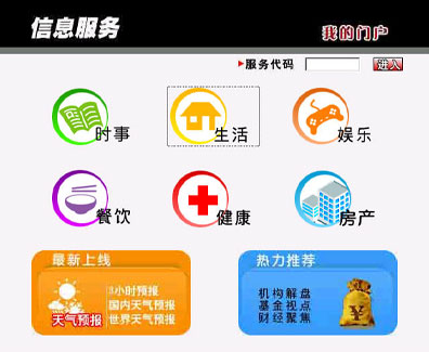 在上海IPTV提供的業(yè)務(wù)中,信息服務(wù)也是眾多用戶喜聞樂見的一項業(yè)務(wù),內(nèi)容覆蓋廣泛。它提供了時事、生活、娛樂、餐飲、健康、房產(chǎn)等信息,其中“時事”一欄呈現(xiàn)了新浪上海熱線實時傳遞的全球最新新聞資訊,讓老百姓“手握遙控器,便知天下事”,“健康”一欄更是一網(wǎng)打盡上海地區(qū)醫(yī)療機構(gòu)的信息資訊,特色?扑阉鳛橛脩籼峁┍憬莸尼t(yī)療信息服務(wù),“房產(chǎn)”中上海地區(qū)各類二手房產(chǎn)訊息一應(yīng)俱全,價格、地段、房型等應(yīng)有盡有。