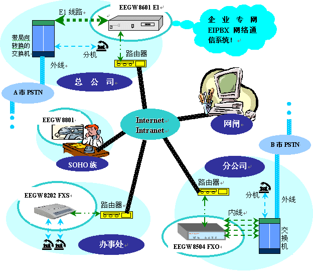 SOHO,全稱small office home office。這是現(xiàn)代生活中的產(chǎn)物,一種情況是規(guī)模較大的公司在全球各地設(shè)置辦事機構(gòu),方便本地的業(yè)務聯(lián)系和處理日常事宜;另一種情況是個人利用自己的業(yè)務知識和關(guān)系,開設(shè)一個家庭辦公室,聯(lián)系代理全球各地同行業(yè)產(chǎn)品;還有一種情況是異地分居的親友和朋友間的聯(lián)系。這三種情況的業(yè)務聯(lián)系廣泛,并且通信量大,所以非常適合采用EIPBX網(wǎng)絡通信系統(tǒng)節(jié)約電話費用。