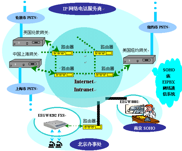 目前,在全球各地蓬勃發(fā)展起一項新興行業(yè)——IP網(wǎng)絡電話服務商,他們利用遍布全球、資源豐富的Internet / Intranet網(wǎng)絡,組織自己的IP電話核心網(wǎng)絡,將該網(wǎng)絡的服務開放給各地的公眾。其核心網(wǎng)絡的網(wǎng)關(guān)完全遵照ITU-T H.323標準,可以解決電話號碼與IP地址的映射,IP地址解析,路由尋路等問題。能夠?qū)崿F(xiàn)SOHO族通過該網(wǎng)絡接入全球各地的市話。