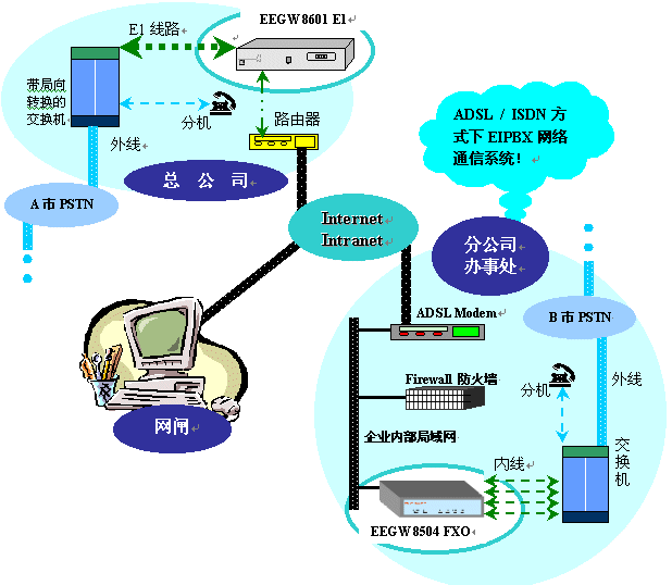 為實現(xiàn)地理位置分散的各企業(yè)分支機構(gòu)間的語音通信,節(jié)約企業(yè)內(nèi)部的通信成本和管理成本,許多公司在選擇ADSL或ISDN等其他寬帶接入技術(shù)接入Internet,同時希望利用該網(wǎng)絡建立內(nèi)部的EIPBX網(wǎng)絡通信系統(tǒng)。