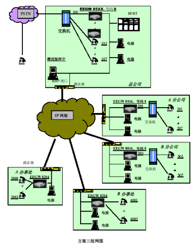 。。本方案有主要配置:總公司配備1臺EEGW8601E1網(wǎng)關(guān)、四個(gè)分公司分別配備1臺EEGW8504FXO網(wǎng)關(guān),四個(gè)辦事處分別配備1臺EEGW8204FXO網(wǎng)關(guān)。在總公司出可以安裝EEGK8001簡易網(wǎng)閘。