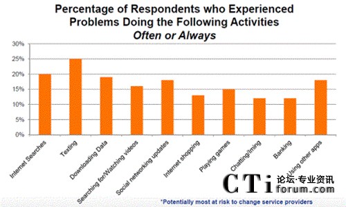 調(diào)查顯示,超過2/3的美國智能手機(jī)用戶從事一些最常見的活動(dòng)時(shí),遭遇了網(wǎng)絡(luò)服務(wù)問題,包括互聯(lián)網(wǎng)搜索、數(shù)據(jù)下載、搜尋或觀看視頻和社交網(wǎng)絡(luò)。此外,在調(diào)查中發(fā)現(xiàn),當(dāng)他們遇到服務(wù)和中斷問題時(shí),消費(fèi)者把責(zé)任歸罪于他們的移動(dòng)網(wǎng)絡(luò)運(yùn)營商商(MNO)。事實(shí)上,幾乎所有被調(diào)查的智能手機(jī)用戶的一半,由于他們的體驗(yàn)問題抱怨他們的移動(dòng)網(wǎng)絡(luò)運(yùn)營商商(MNO)。
