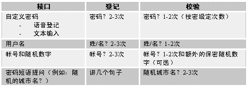 對(duì)Nuance方案,鑒別使用的密碼接口方案或類型都不受限制。各公司可自由選擇最適合于應(yīng)用系統(tǒng)的任何接口;如果以后覺得別的接口更加有效,用戶無需選擇新的技術(shù)提供商即可改變接口。聲紋鑒別中的這種靈活性和實(shí)用性是前所未有的。下表列出部分Nuance可實(shí)現(xiàn)的不同用戶接口: