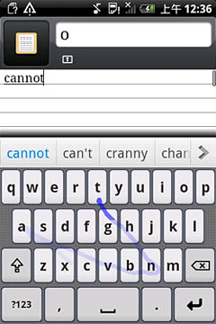 如圖所示,Nuance T9 Trace英文輸入方案對于各種不同的字母組合都能有效識別,像“google”這種既有連續(xù)又有間斷重復(fù)字母的單詞也不在話下,一次就能精準(zhǔn)輸出。另外,該輸入法還可以省去標(biāo)點符號,如“don"t”“can"t”等單詞,用戶只需滑觸“d-o-n-t”這四個字母,輸入法就會自動識別。